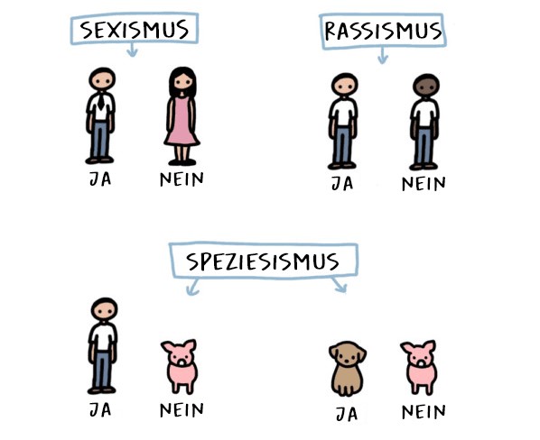 Speciesism is just as irrational as racism, sexism, and homophobia, as it discriminates against animals solely based on their species. What is the ethically significant difference between dogs and pigs that justifies categorizing one as „pets“ and using the other for meat production? This distinction is based on no ethically relevant grounds and is comparable to the discrimination of humans based on their skin color or sexual orientation. The exploitation of animals cannot be justified—except in a survival situation—regardless of the species of the animal. Once we have access to vegan alternatives, we are no longer in a survival situation.
